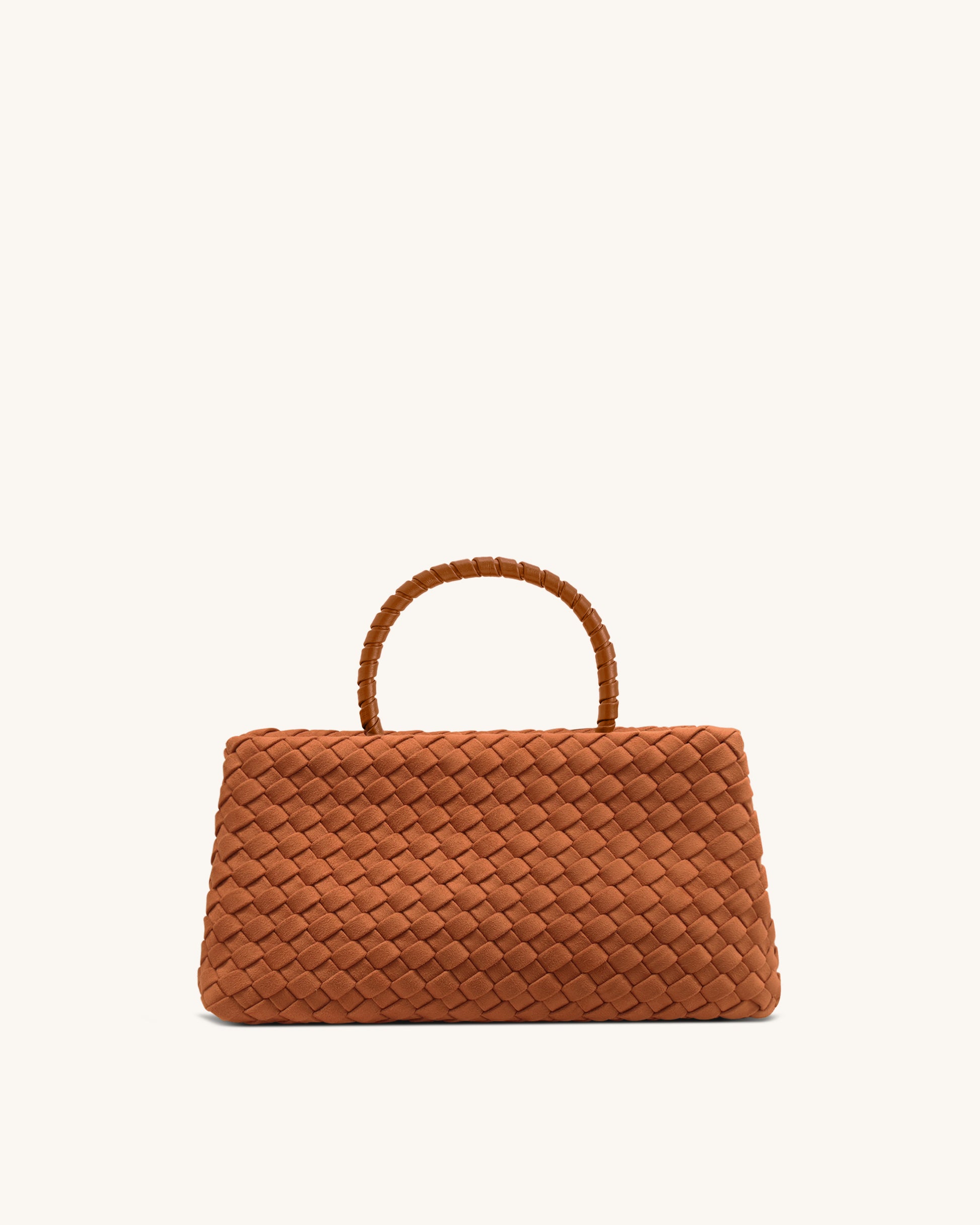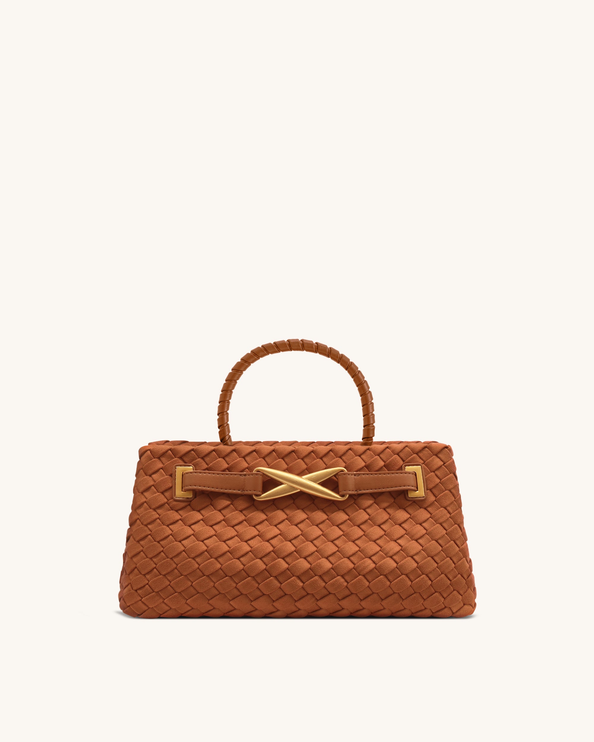 This structured top handle bag features a rich caramel tone with a handwoven texture and elegant gold-tone hardware. The X-shaped buckle detail adds a modern twist to its classic silhouette, making it a refined choice for both everyday and formal occasions.