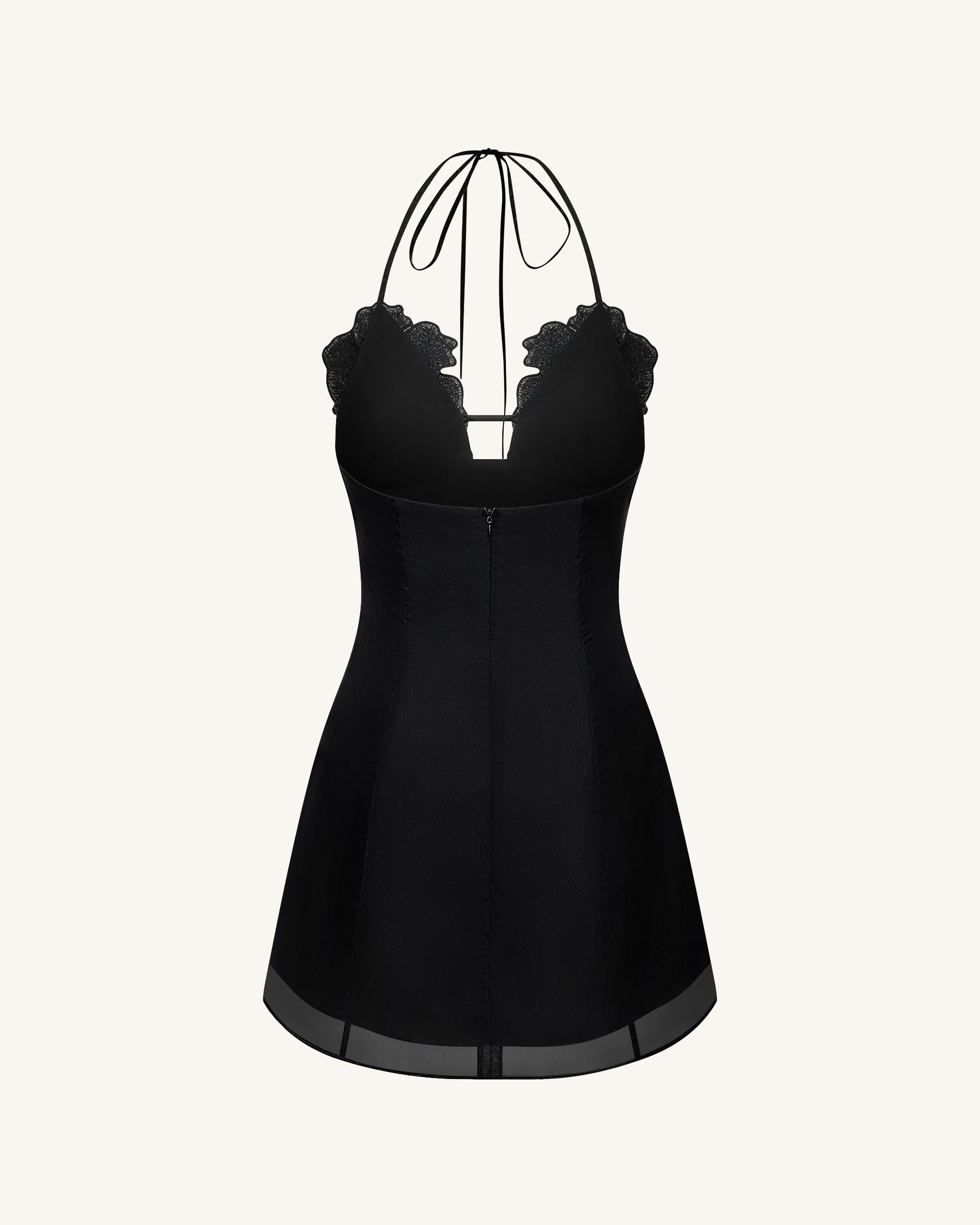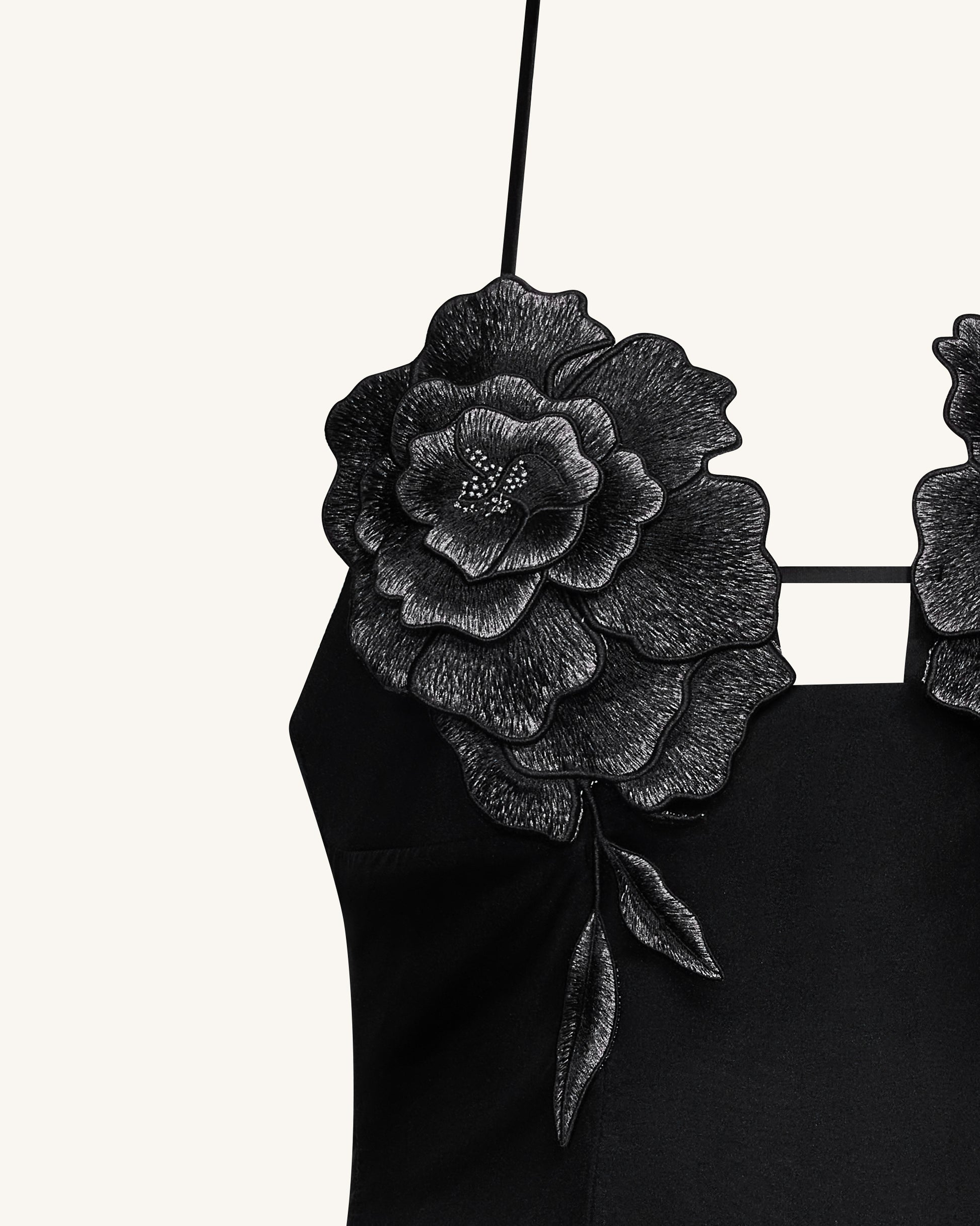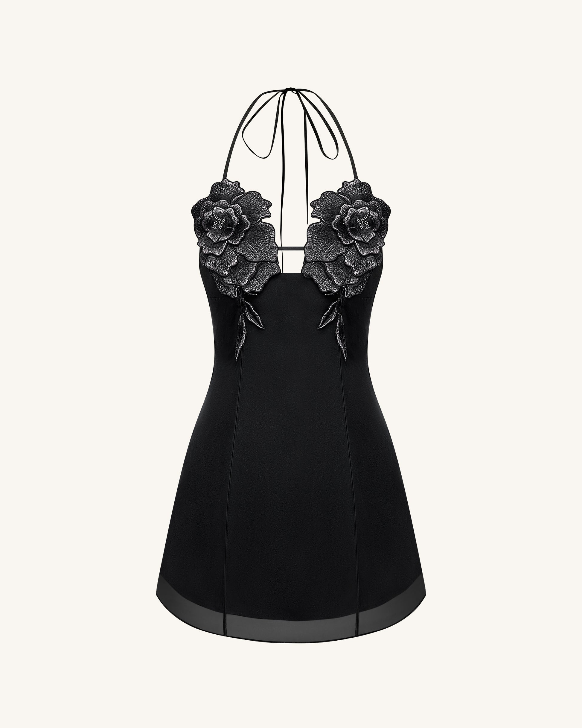 Make a bold entrance in this black halter mini dress featuring dramatic 3D floral appliqués on the bust. The sheer hem and flattering A-line silhouette add a touch of elegance, while the tie-back halter neckline offers adjustable support and a hint of allure. A perfect piece for parties, nights out, or statement styling.
