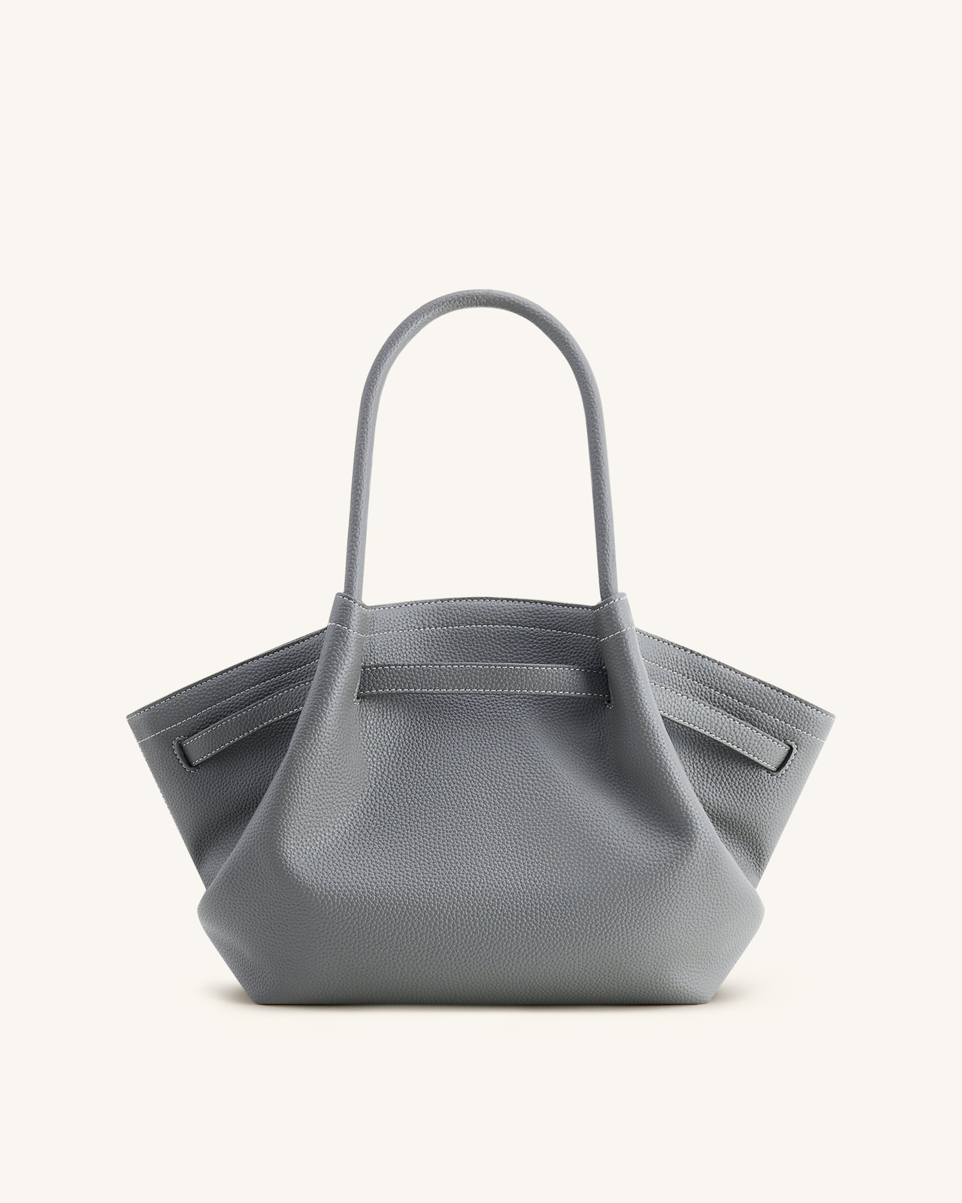 This structured tote bag in slate grey features a sculptural trapezoid silhouette and a subtly grained texture for a refined, modern look. Designed with long top handles and a magnetic closure, it's spacious enough for daily essentials while elevating any outfit with understated elegance.