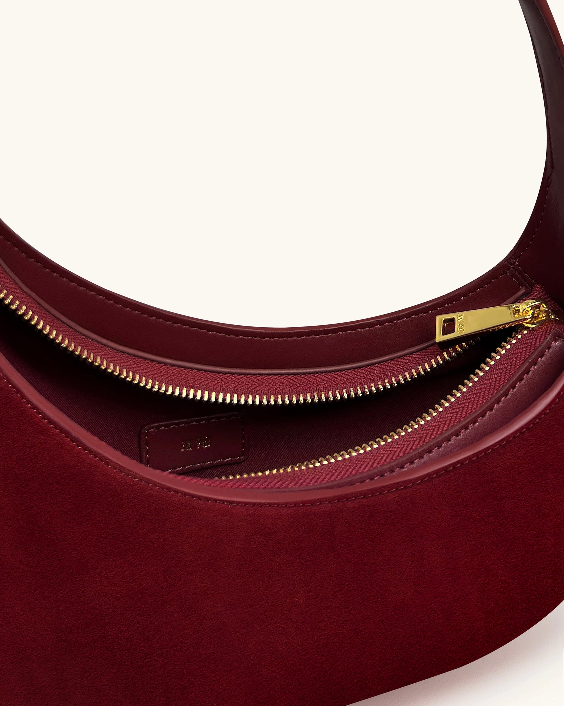 This wine red shoulder bag features a sleek crescent silhouette crafted in faux suede, accented with long dramatic fringe for a bold, fashion-forward look. Lightweight yet structured, it effortlessly blends boho flair with urban edge—ideal for day-to-night styling.