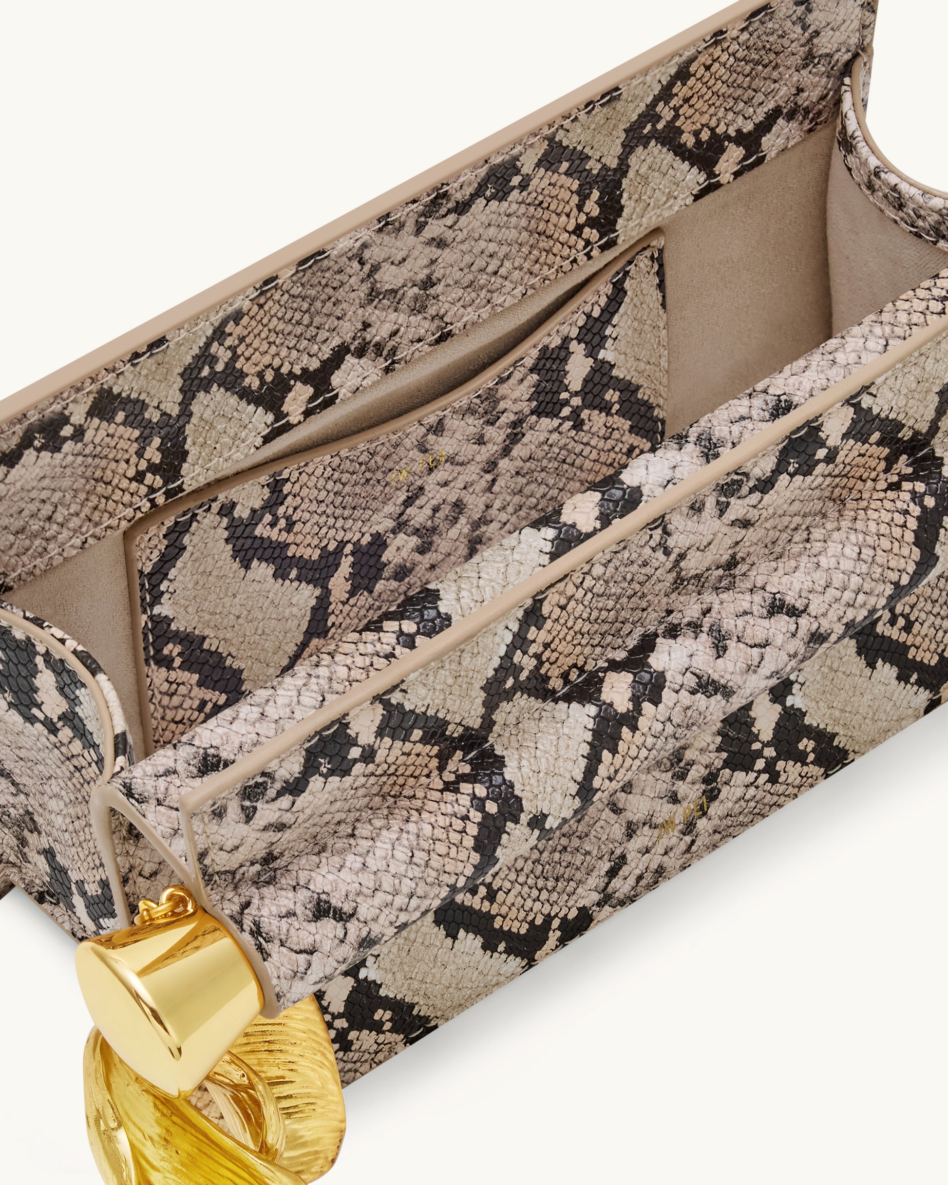 Compact vegan leather clutch in a striking snake pattern. Features gold hardware with sculptural charm detailing. Fits an iPhone 16 Pro Max and essentials. Perfect for evening or standout day style.