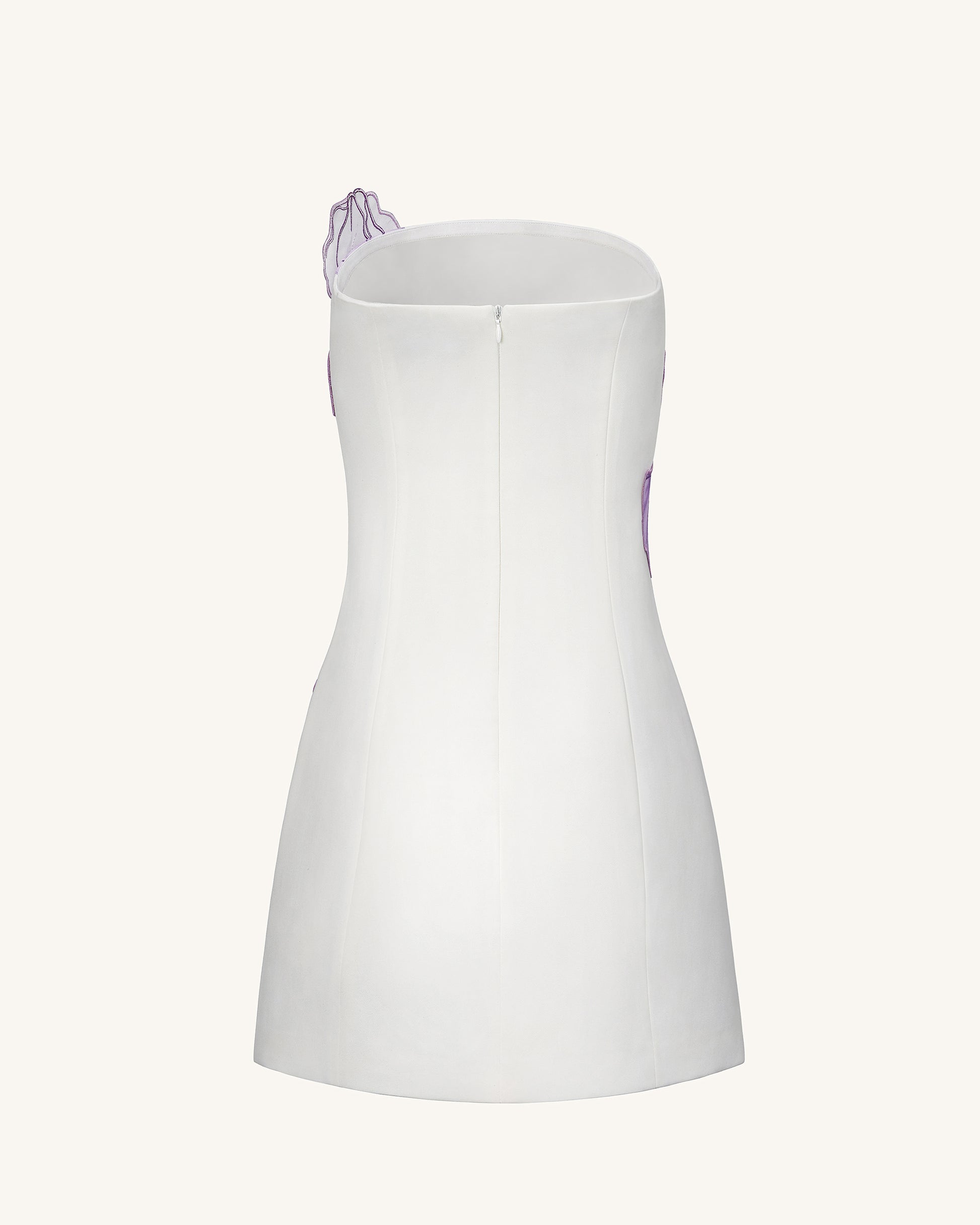 This strapless mini dress features a fitted silhouette and a smooth, crisp fabric. Large iris flower motifs in pastel purple and green create a bold visual across the front. The clean hemline finishes just above the knee. The look is minimalist with statement flower graphics.
