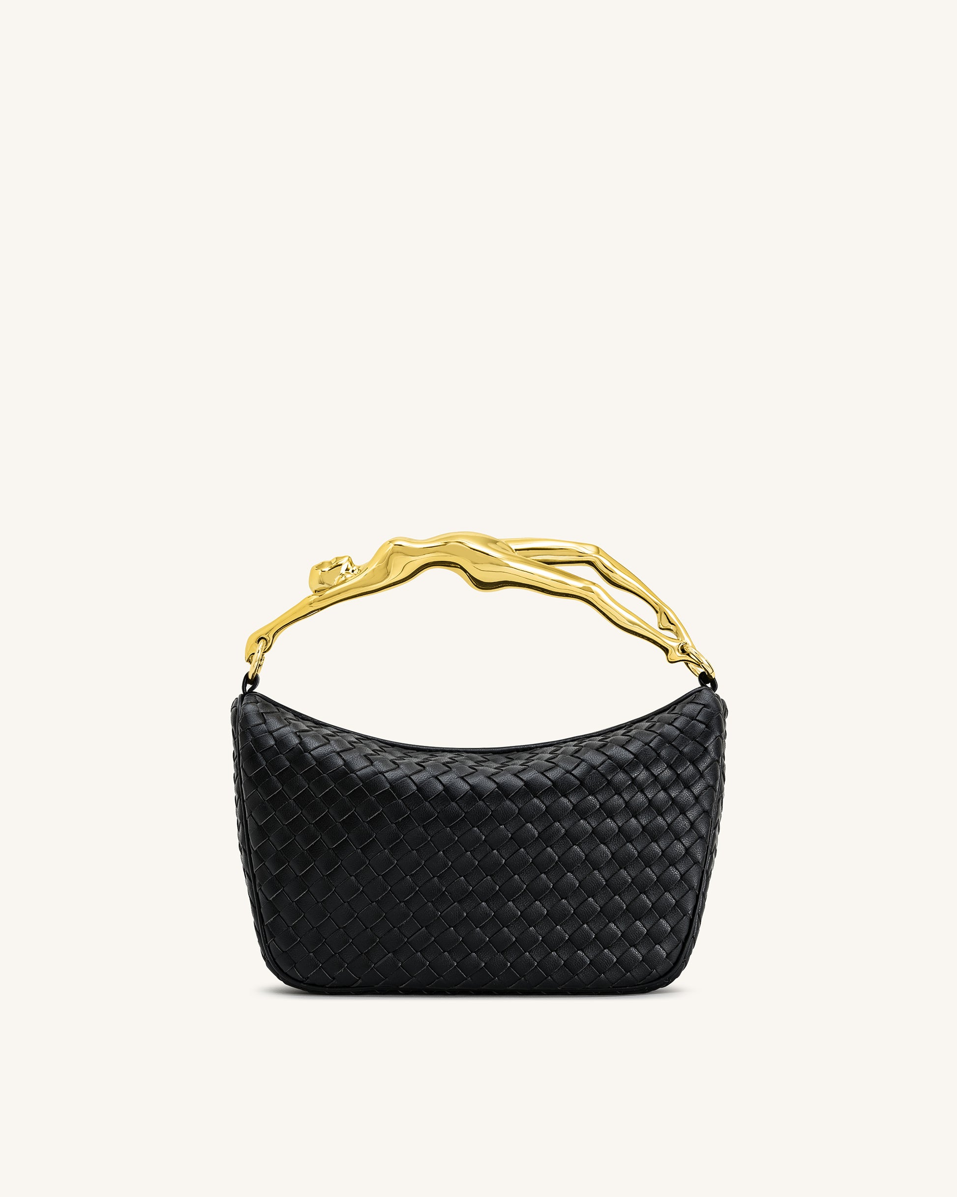 This handbag features a sculptural gold-tone metal handle in the shape of a reclining human figure, paired with a sleek jet black woven body. Its compact silhouette and refined details combine artistic flair with modern sophistication, making it a striking accessory for any occasion.