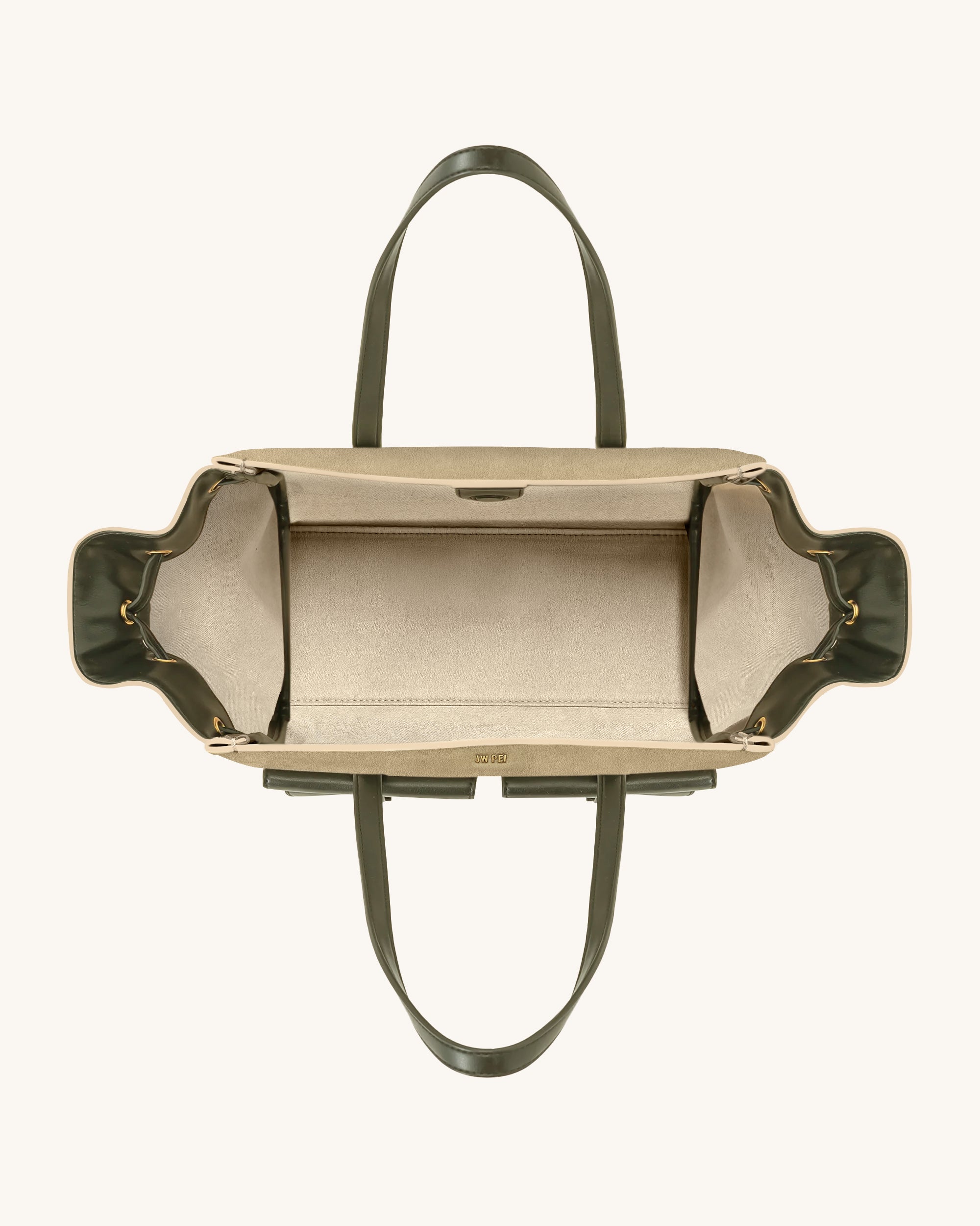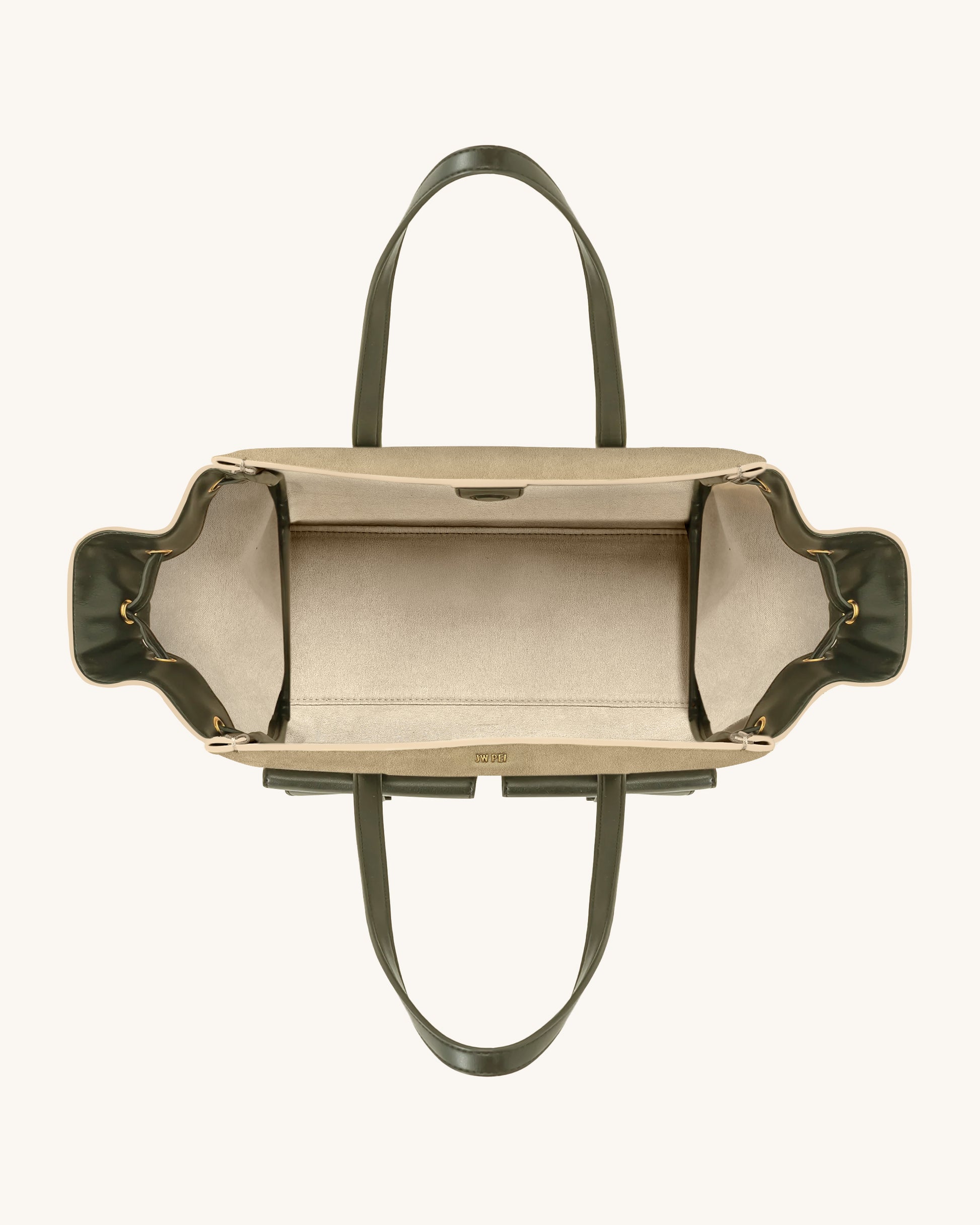 Spacious, versatile, and chic. Features dual front pockets with golden hardware and soft suede-effect finish. Suited for daily essentials and an iPad Mini.