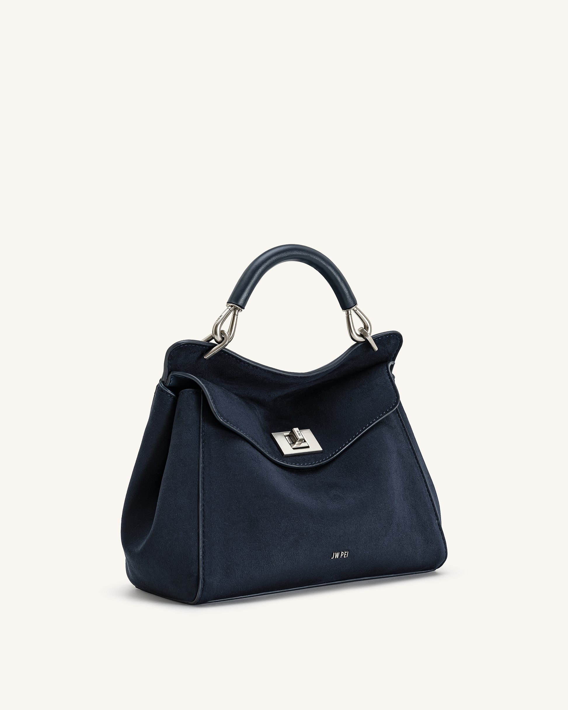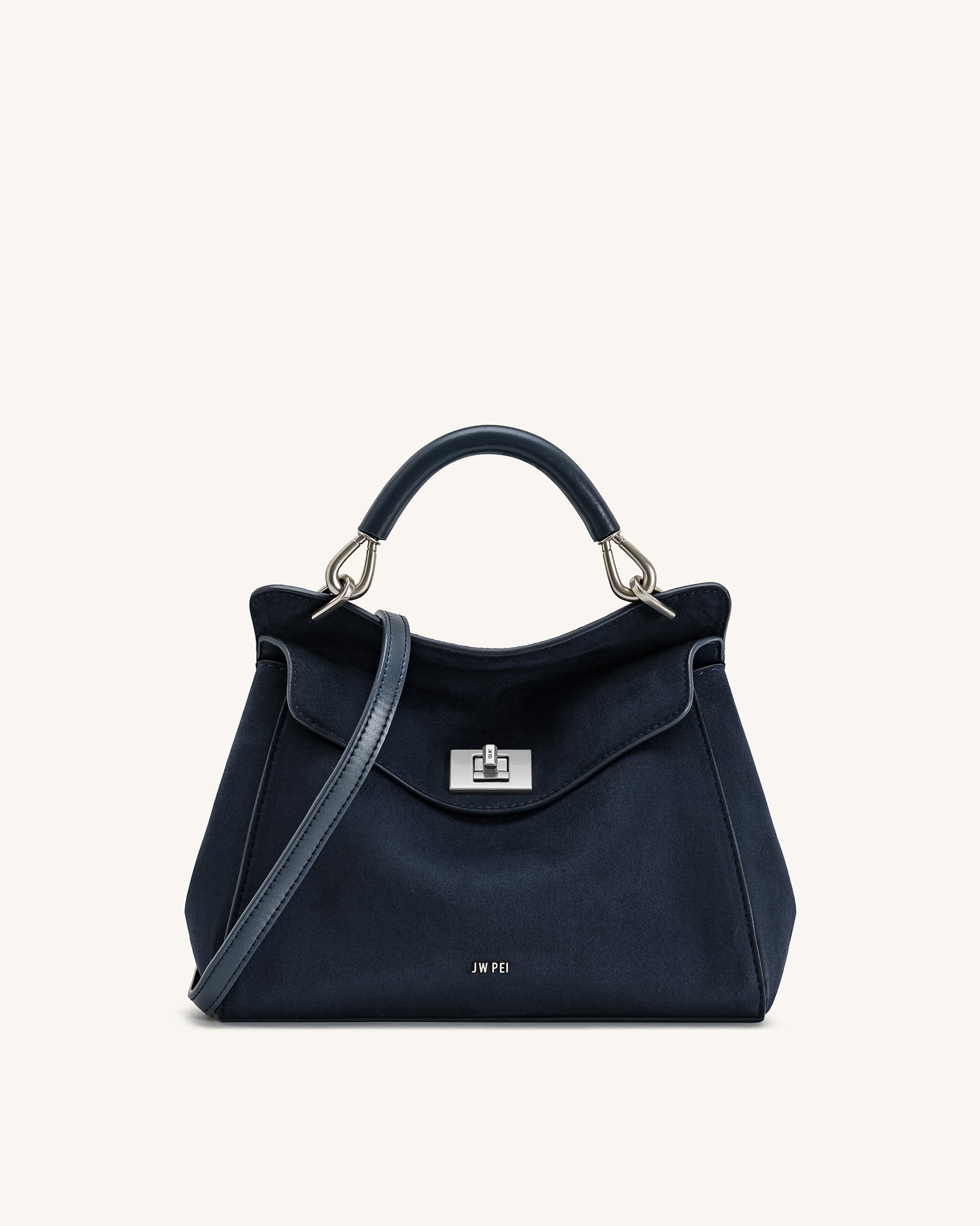 This elegant top-handle bag in classic navy blue features a soft suede-like texture and a sleek silver-tone twist-lock closure. Designed with a structured handle and detachable crossbody strap, it combines timeless sophistication with everyday functionality—perfect for work, meetings, or city strolls.