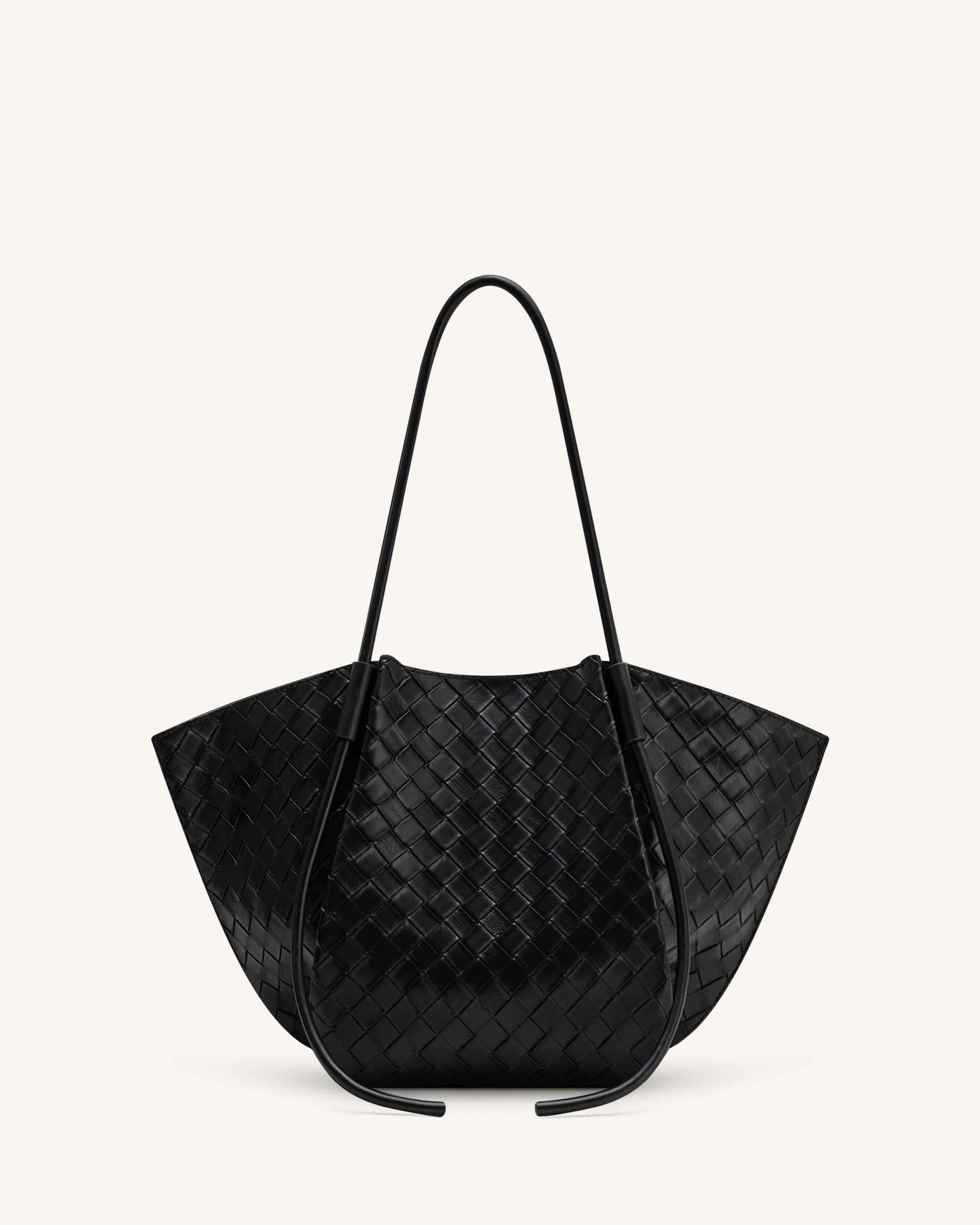 Distinctive, modern, and functional. Features a striking woven texture with bold structure. Designed for hand or shoulder carry. Ample size fits daily essentials and large phones.