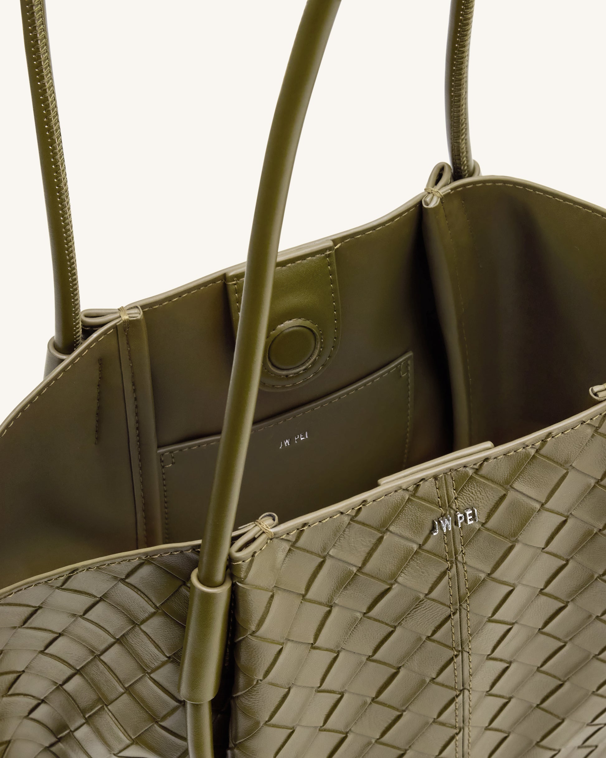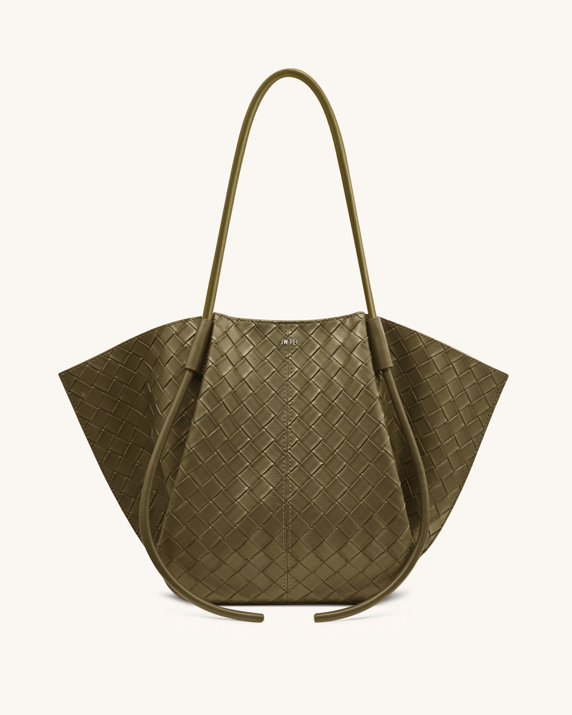 Sleek and practical woven tote in olive green. Soft vegan leather with a spacious, elegant silhouette. Features long shoulder straps for versatile carrying.
