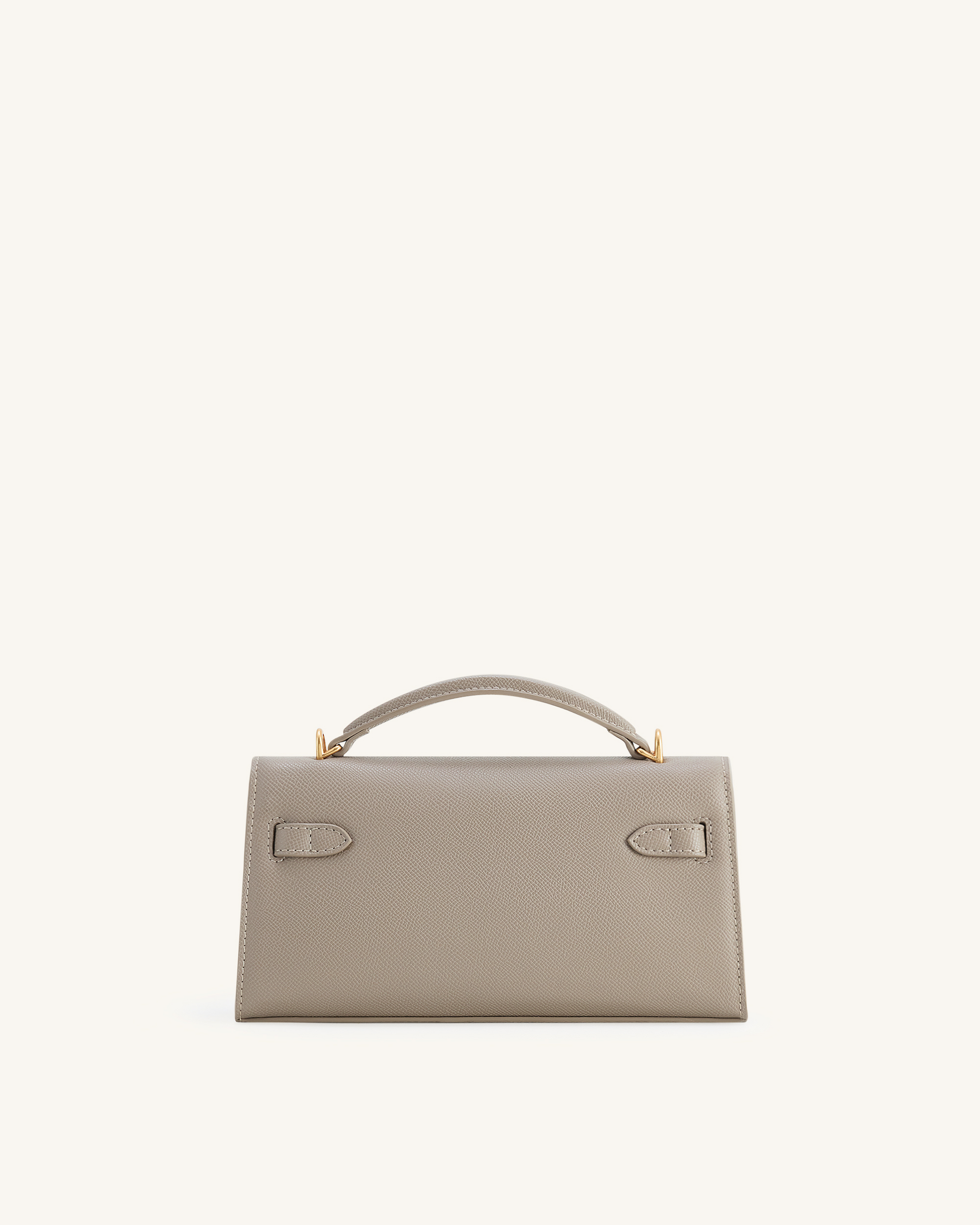 Structured, modern, and versatile. Neutral taupe color with gold hardware. Ideal for both hand carry and crossbody use.