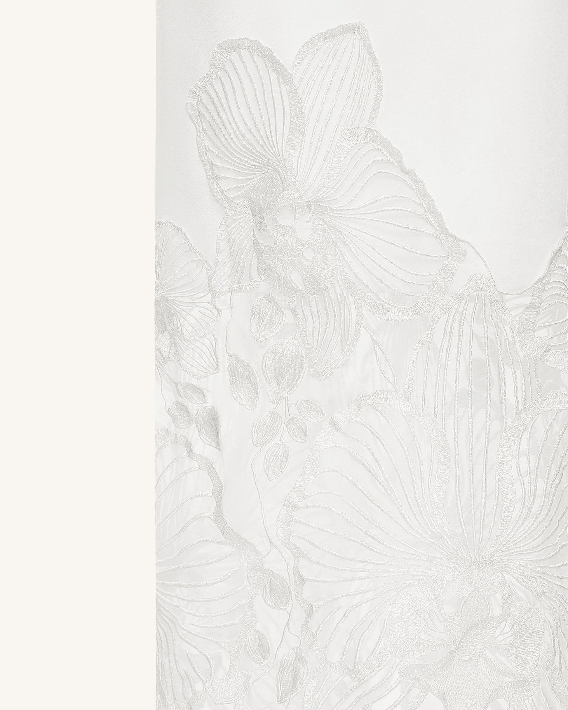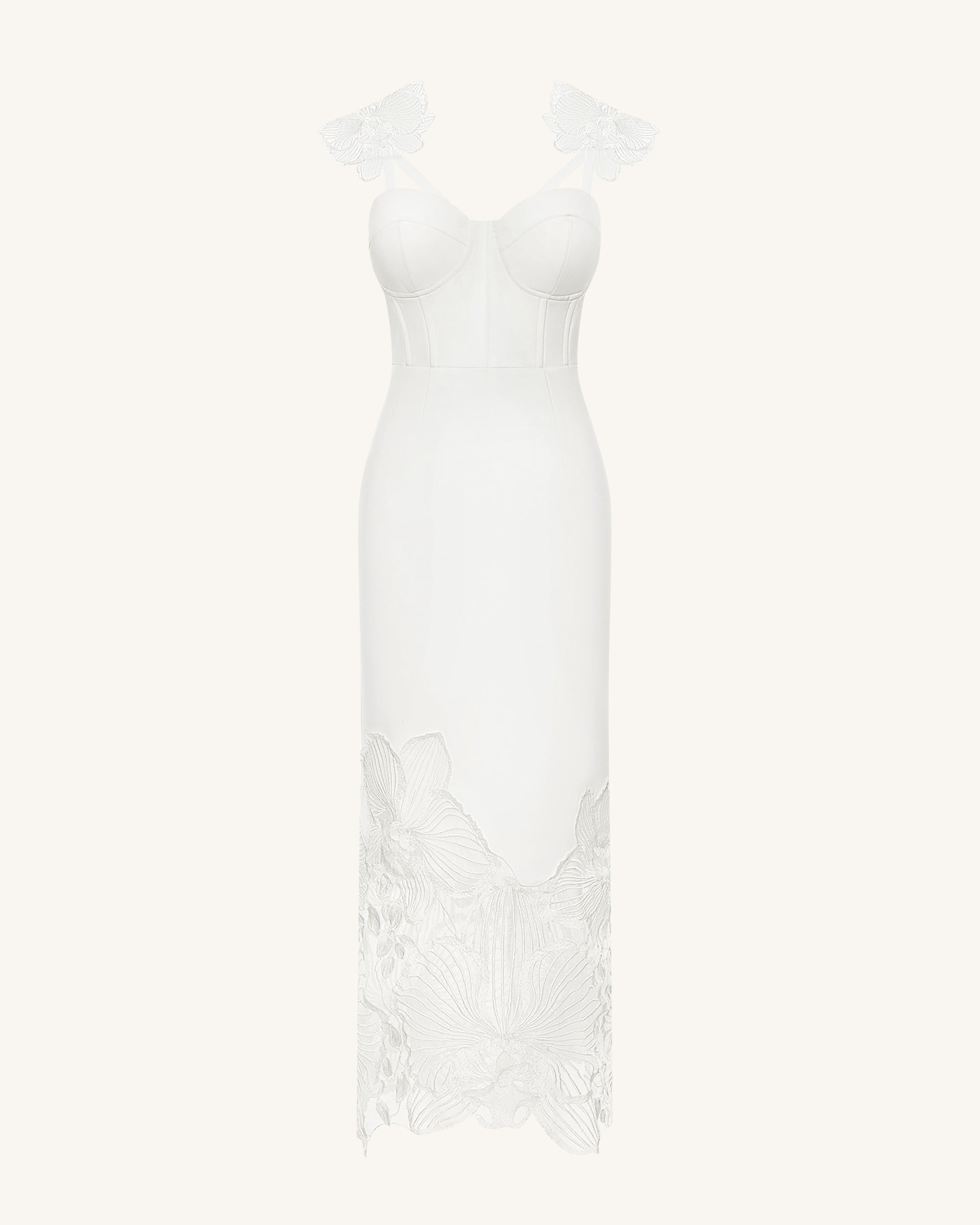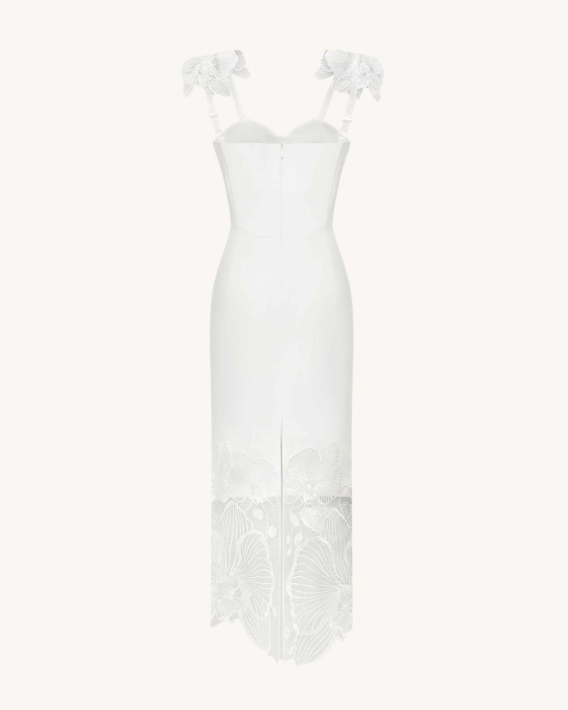 This elegant white midi dress features structured corset-style cups and delicate shoulder straps adorned with 3D floral appliqués. The fitted silhouette highlights your curves, while the hem is finished with intricate see-through floral embroidery for added romance and texture. A perfect piece for bridal events, garden parties, or elegant evenings.