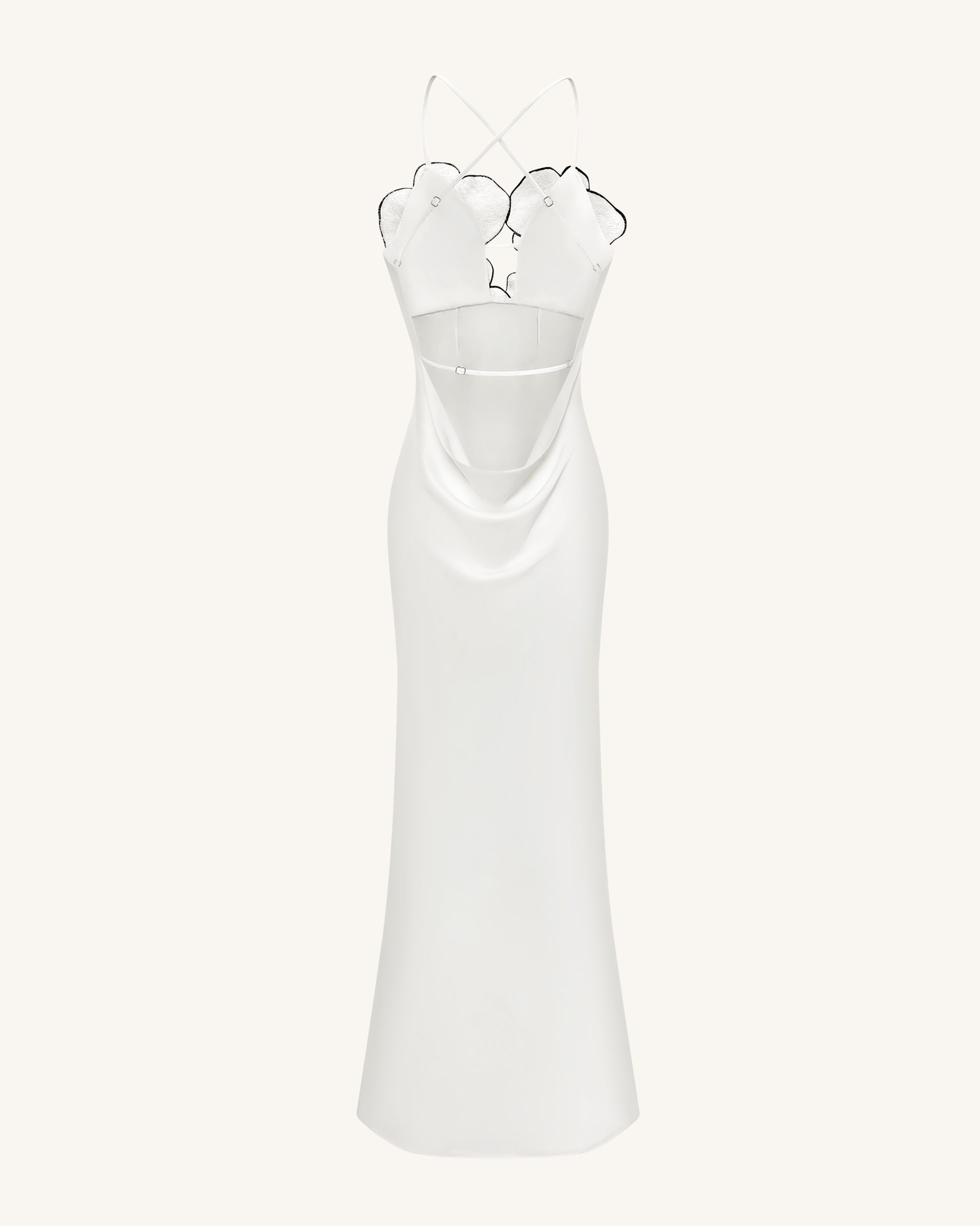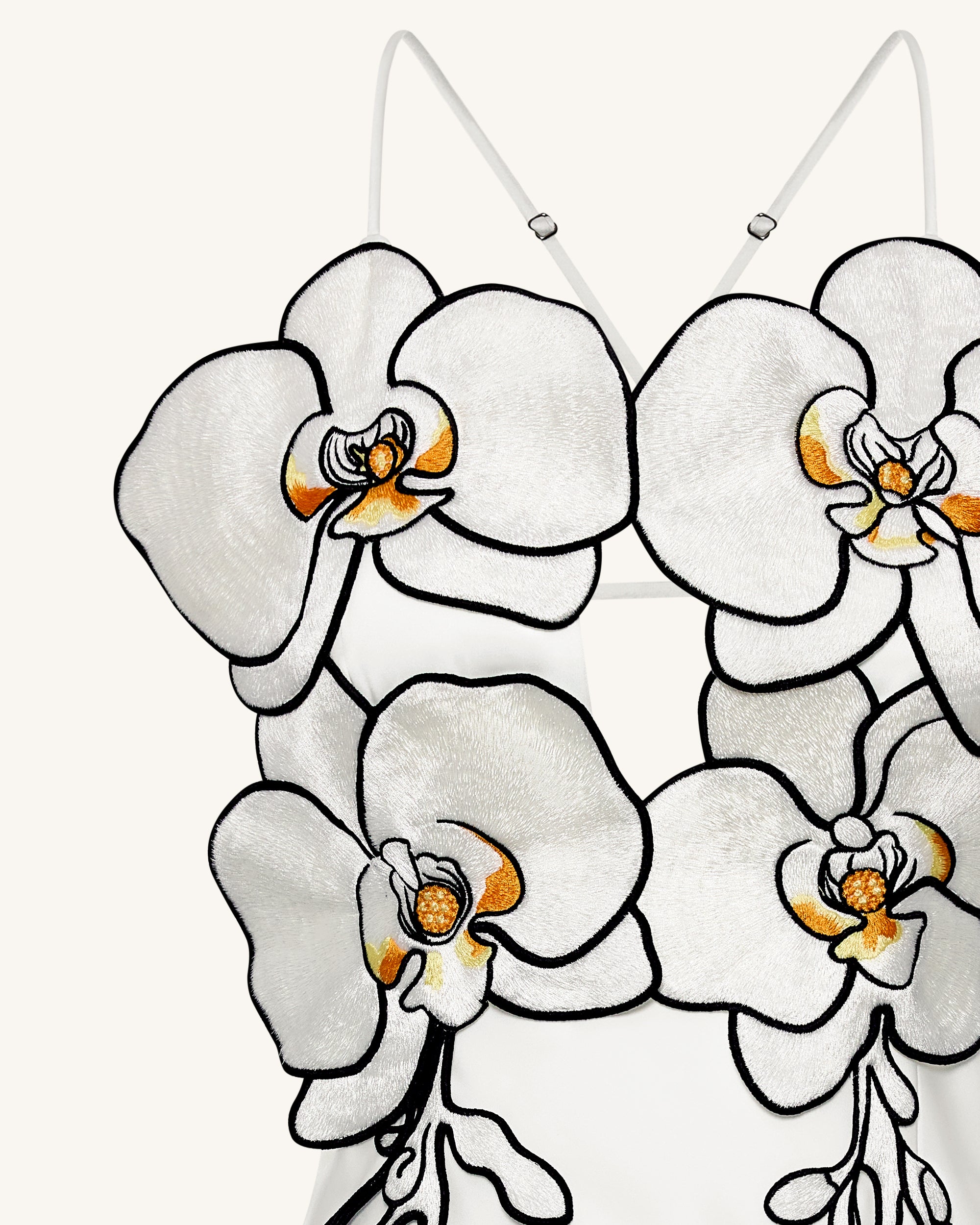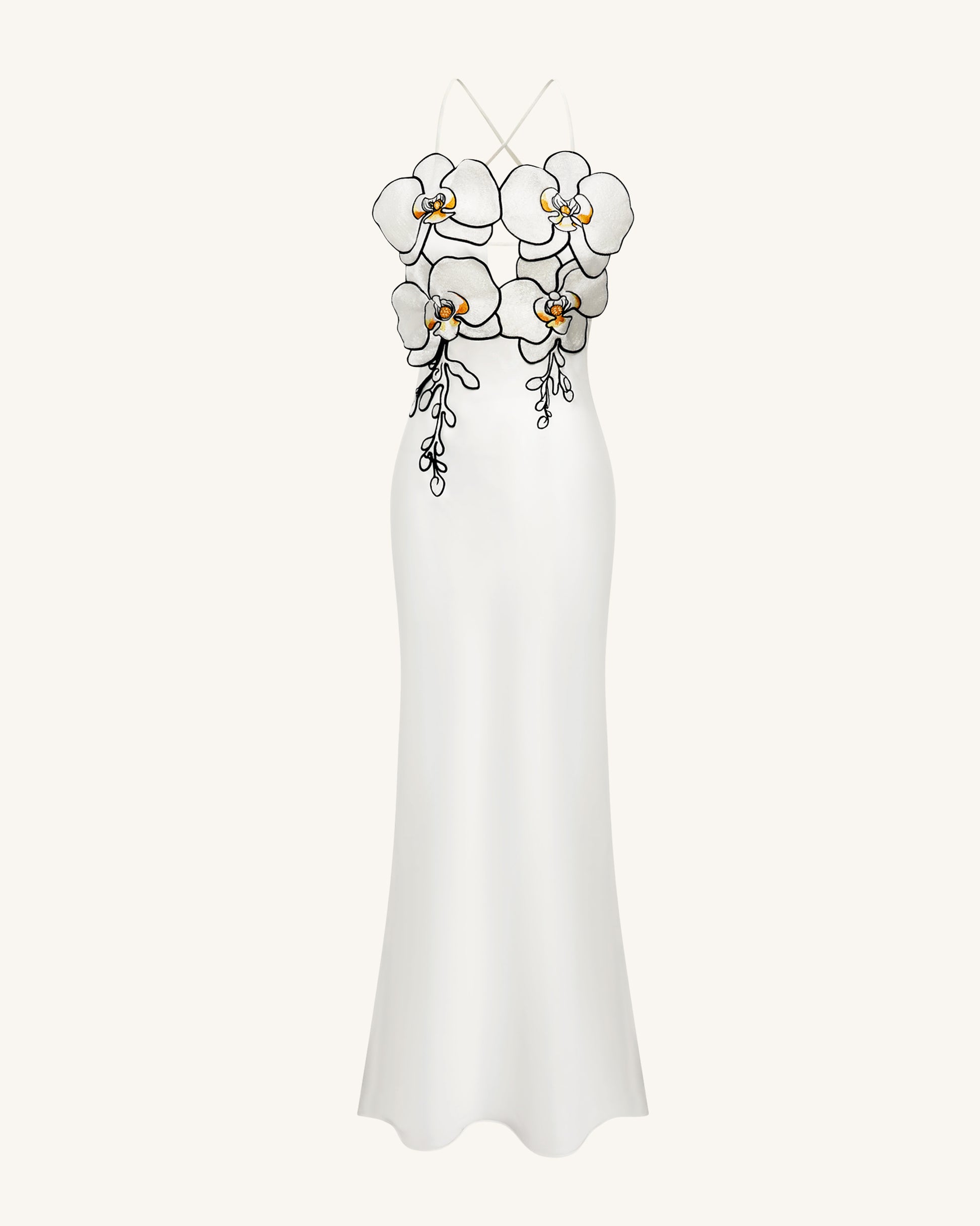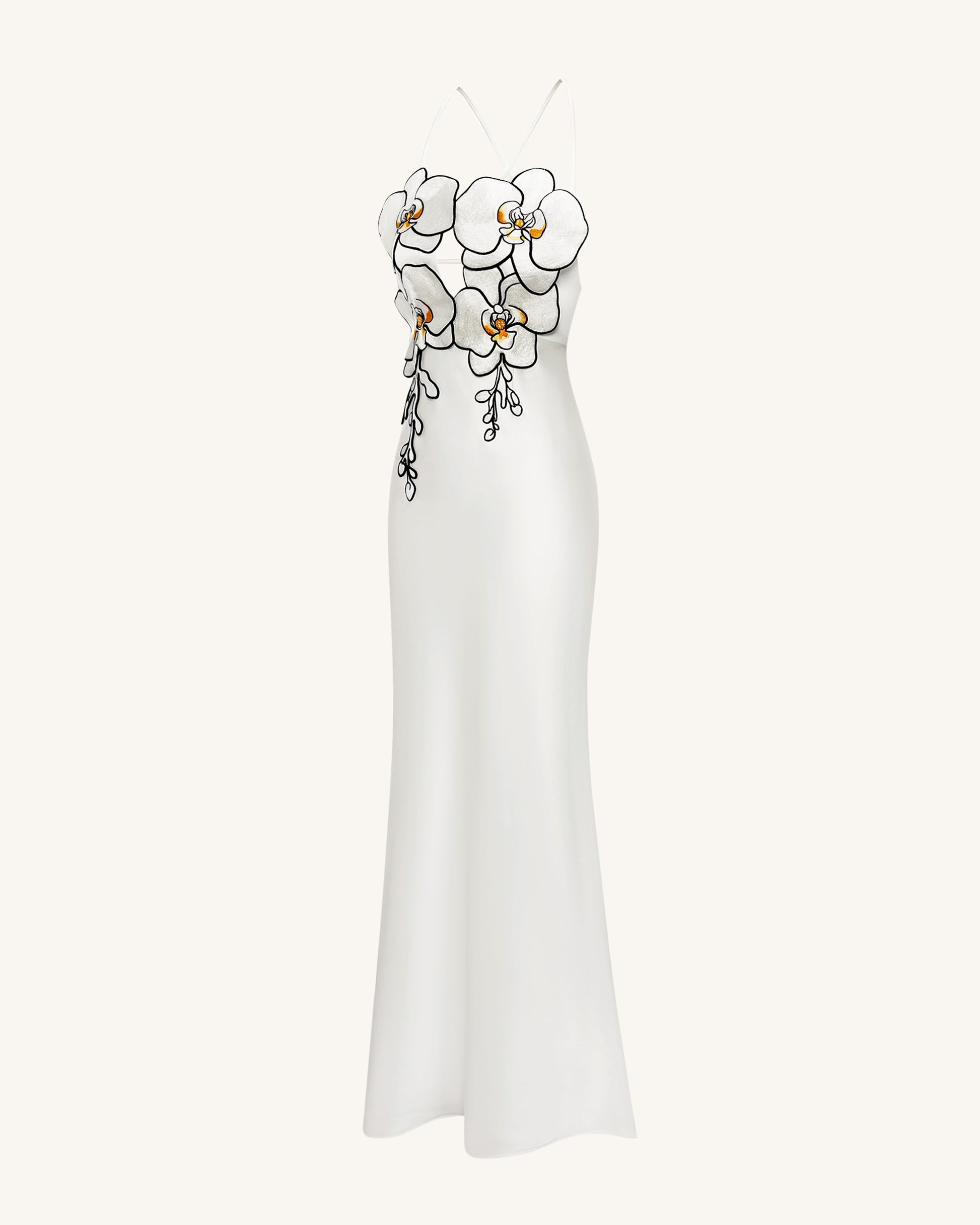 This stunning white evening dress features bold orchid-shaped embroidery across the bodice, creating a captivating 3D floral effect. The figure-hugging silhouette and side slit add an elegant touch, while the open back with criss-cross straps enhances its sensual charm. A perfect choice for formal events, red carpets, or fashion-forward occasions.