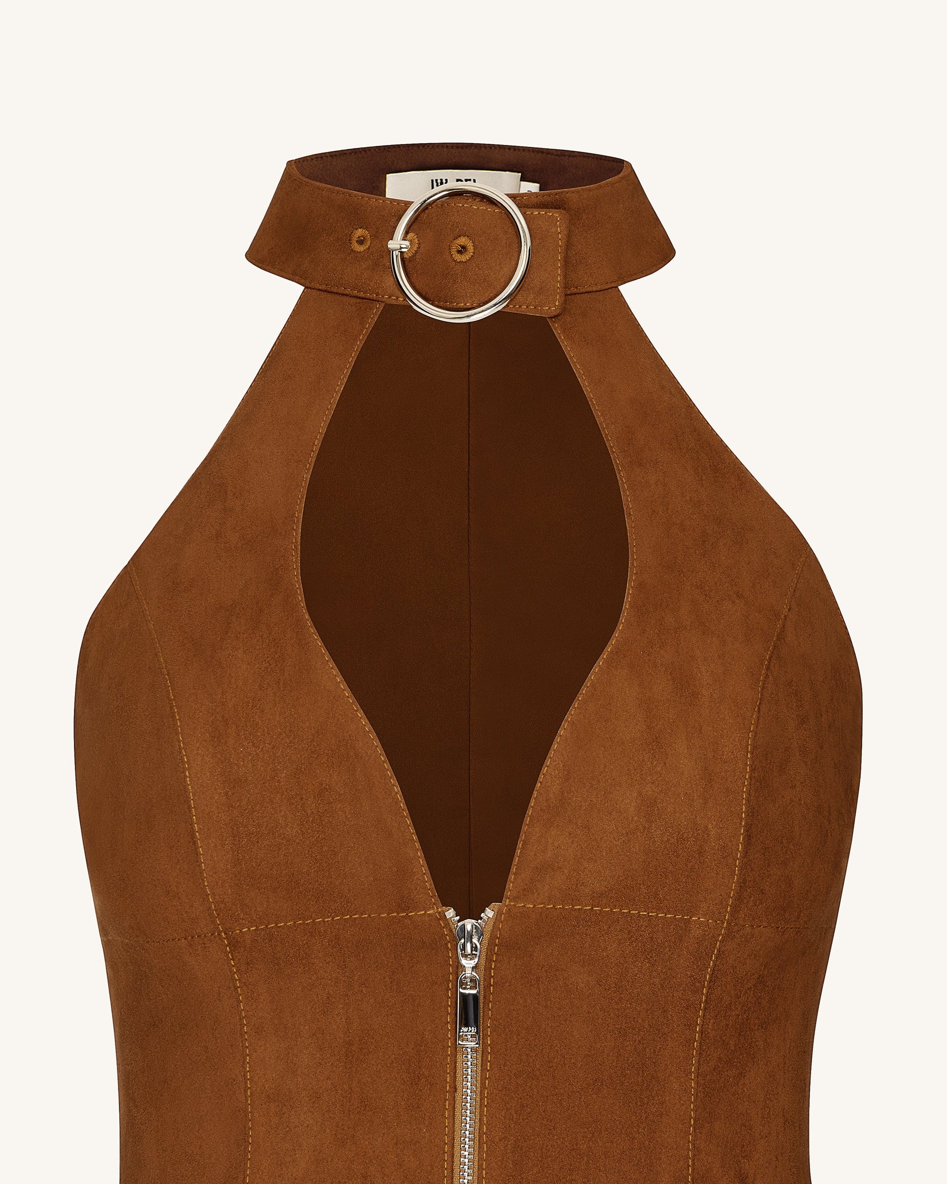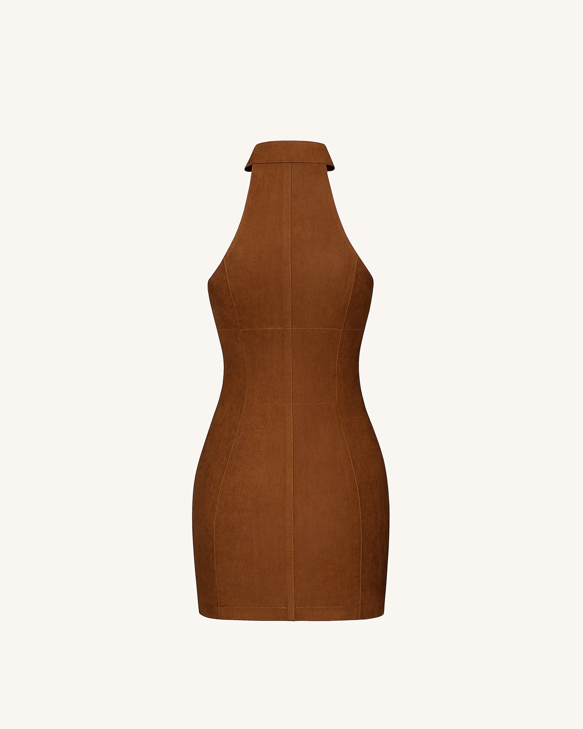Ruby Halter Neck Zipper Mini Dress - Brown