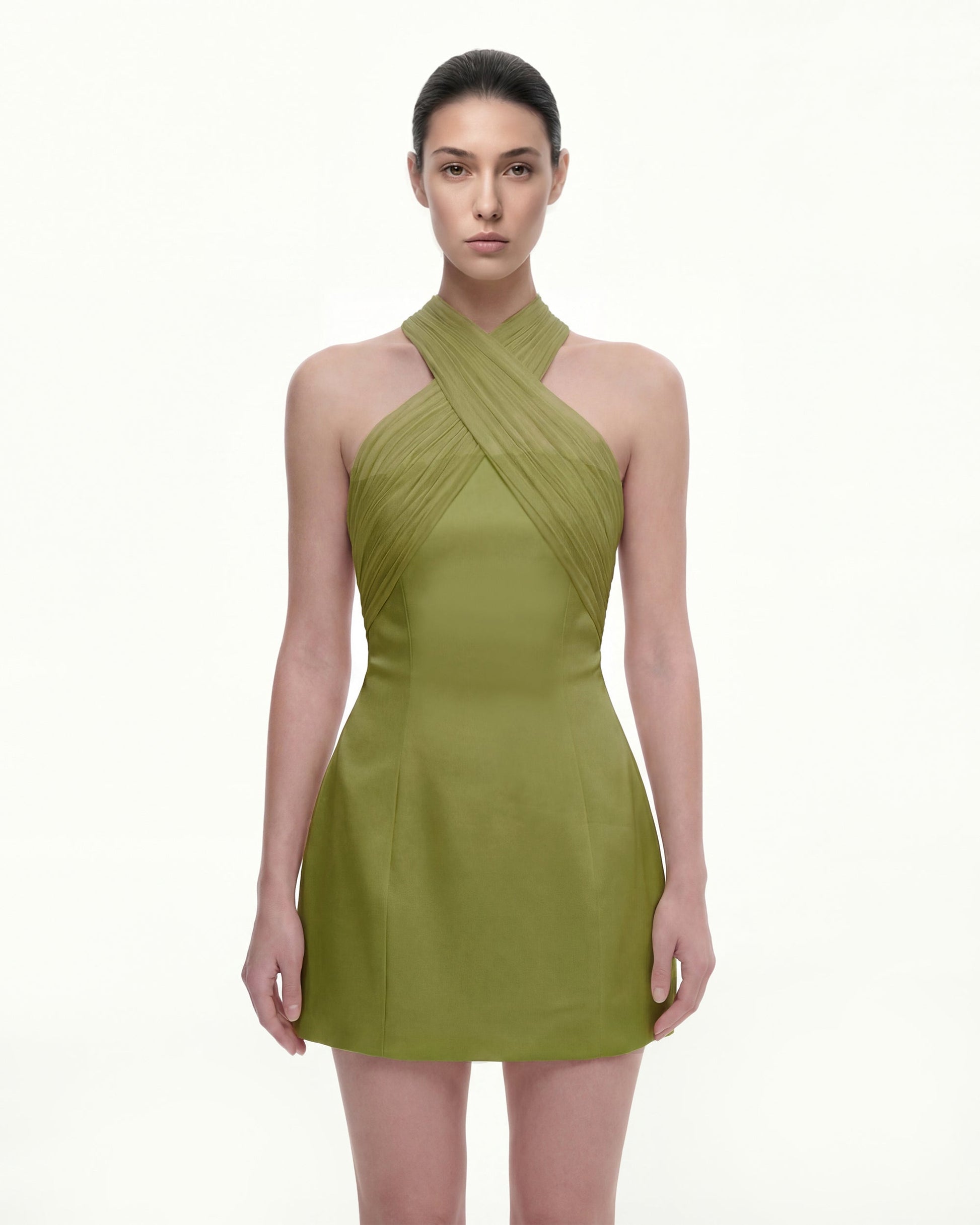 Satin Mini Dress with Tulle Cross-Halter - Olive Green