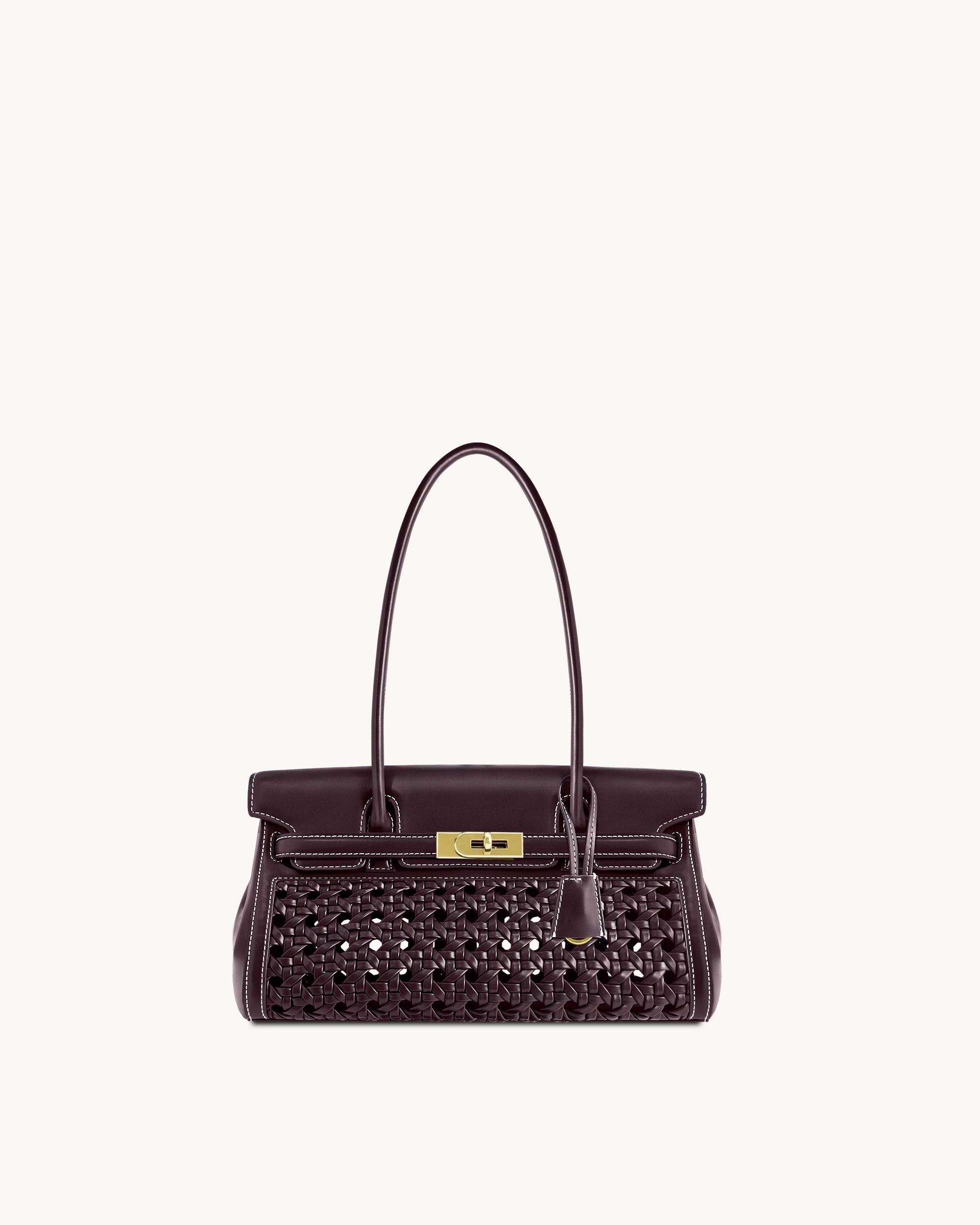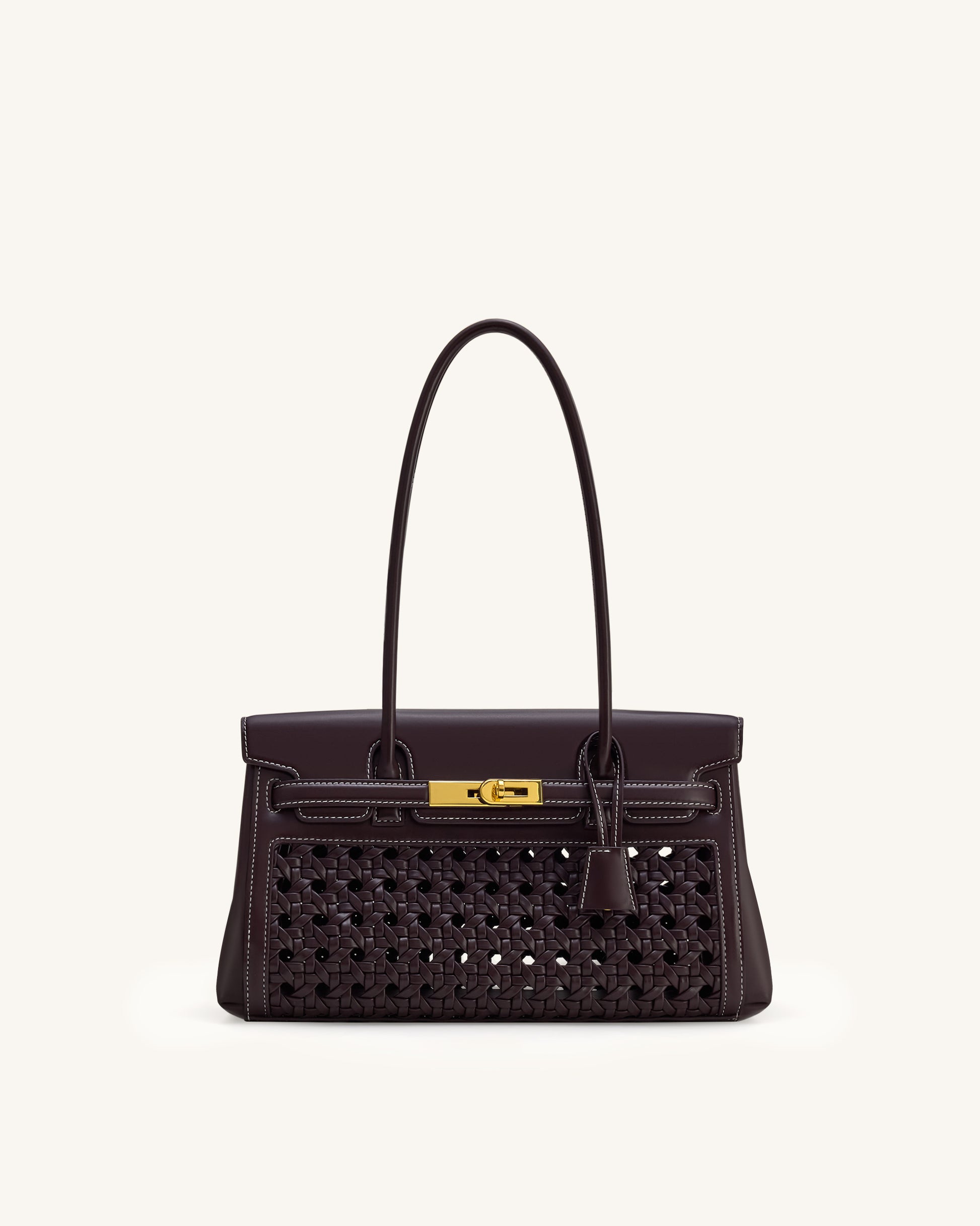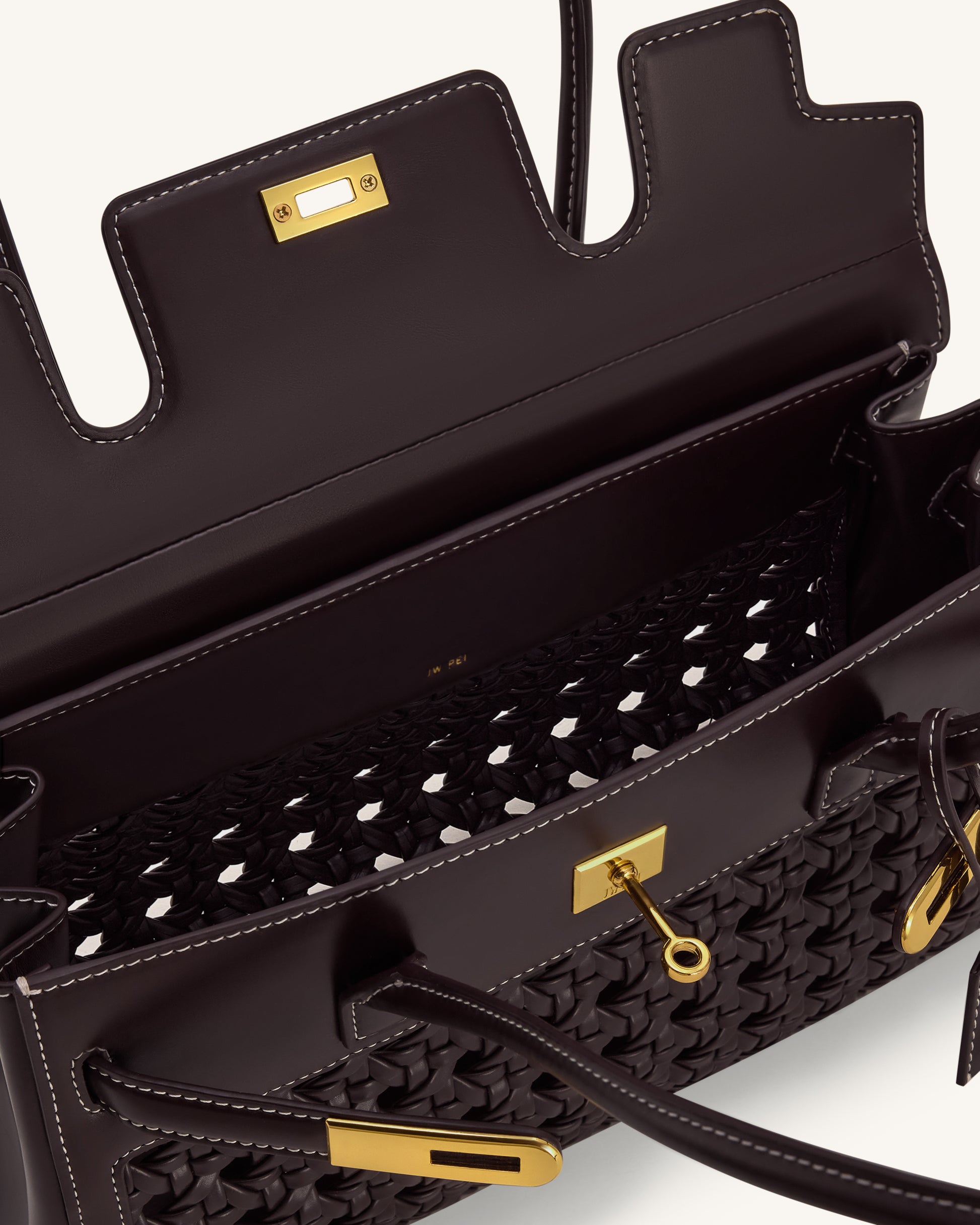 Elegant top handle bag with woven front and gold hardware. Spacious, structured, and stylish, perfect for daily or office use. Smooth texture and sophisticated look make it versatile and modern.